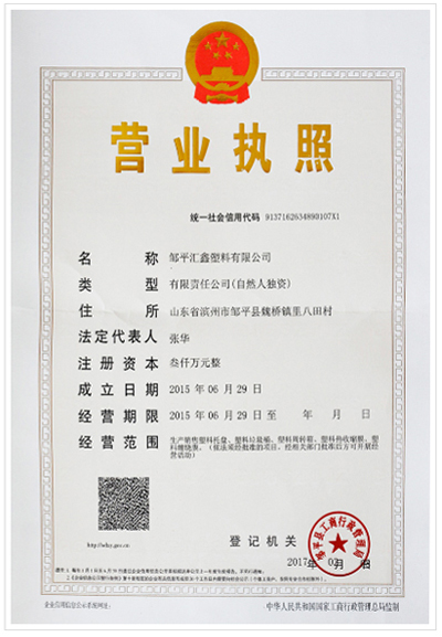 山東匯鑫塑料托盤生產(chǎn)廠家營業(yè)執(zhí)照